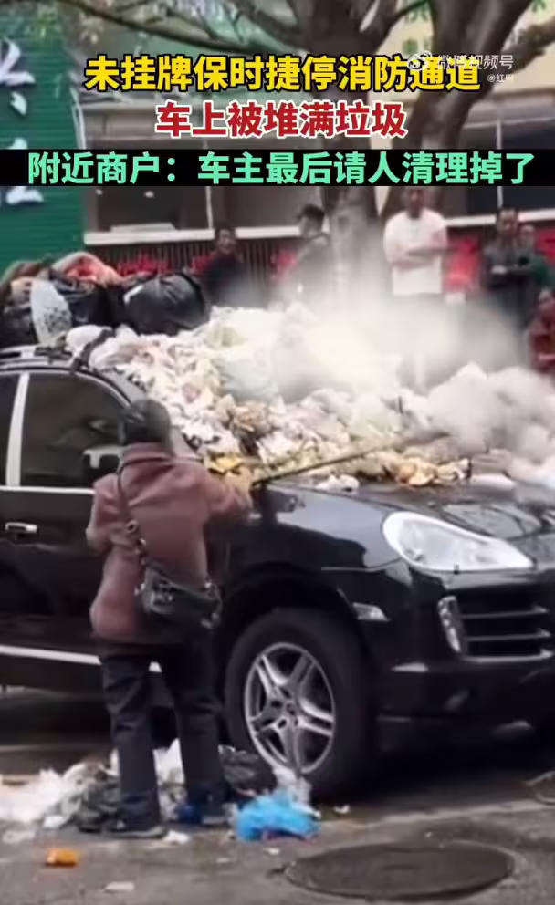 有人經過發現檢舉不了,直接選擇私下教訓,開始把垃圾丟在保時捷上。到了隔天一早,名貴的保時捷已經狼狽不堪,從車頂到擋風玻璃上全被堆滿一包一包的垃圾。附近住戶表示早上上班看到這幕,推測車子是前一晚停的,但不知道是誰丟的垃圾,保時捷旁邊剛好也是垃圾桶擺放處。最後車主是自己請人去收拾愛車的慘況。