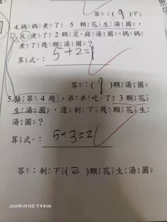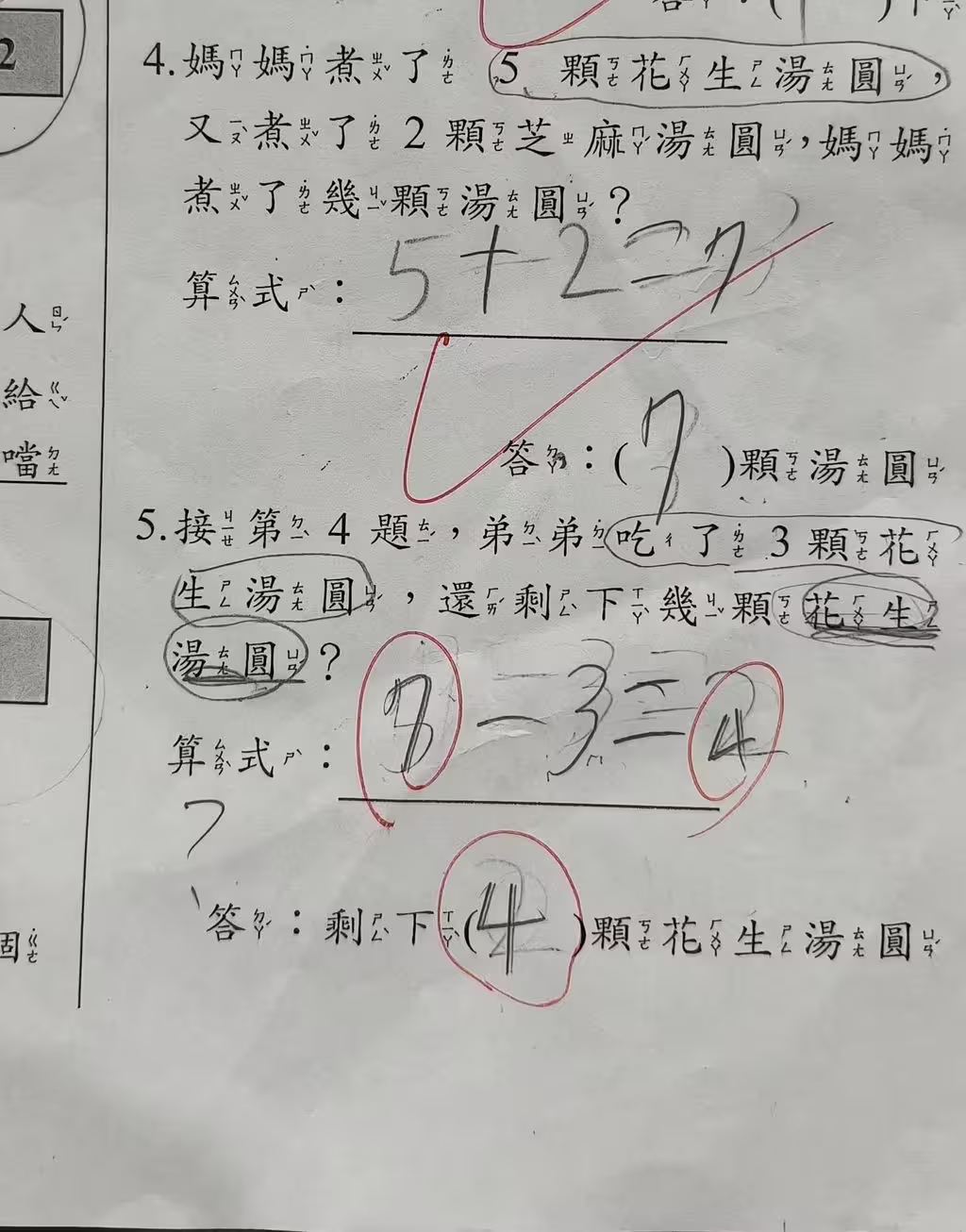 下一題接著問「弟弟吃了3顆花生湯圓,還剩下幾顆花生湯圓?」孩子算式寫下「5-3=2」,答案為剩2顆花生湯圓,怎料老師卻判定錯誤,將答案改為「7-3=4」,認為剩下4顆湯圓才是正解。
