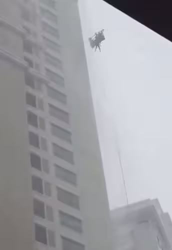 網路流出的影片畫面相當驚悚。強風直接把工人拋出吊籃外,雖然安全裝備讓他沒有墜落,但整個人就這樣懸在半空中,在狂風中被不斷甩動。長達15分鐘的時間裡,他的身體像鐘擺一樣左右擺盪,多次重重撞上大樓堅硬的混凝土外牆,畫面令人不忍直視。